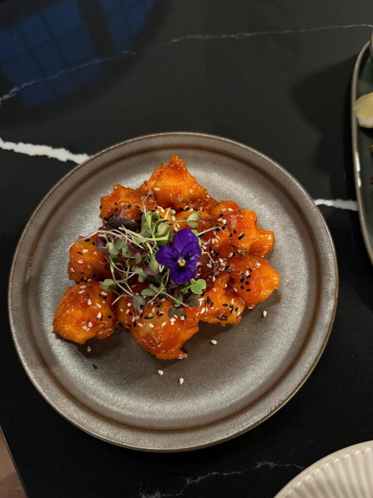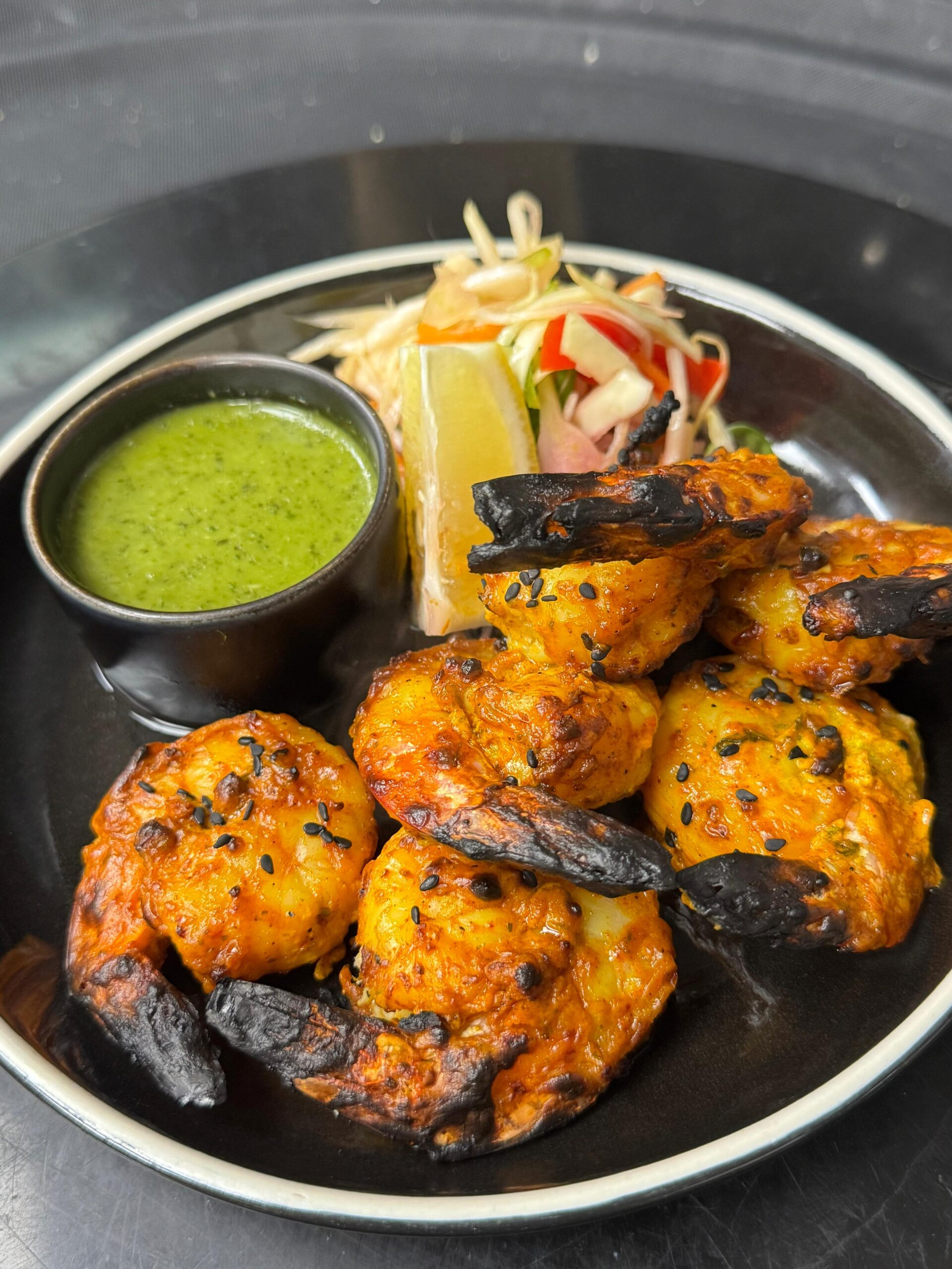 Stir-fried cauliflower in a garlicky,tangy thecha sauce grilled to perfection for a bold smoky flavor