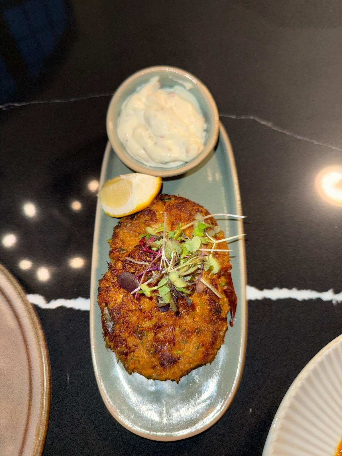 Crispy , golden crab cakes infused with. South Indian spices delivering a savory and aromatic bite